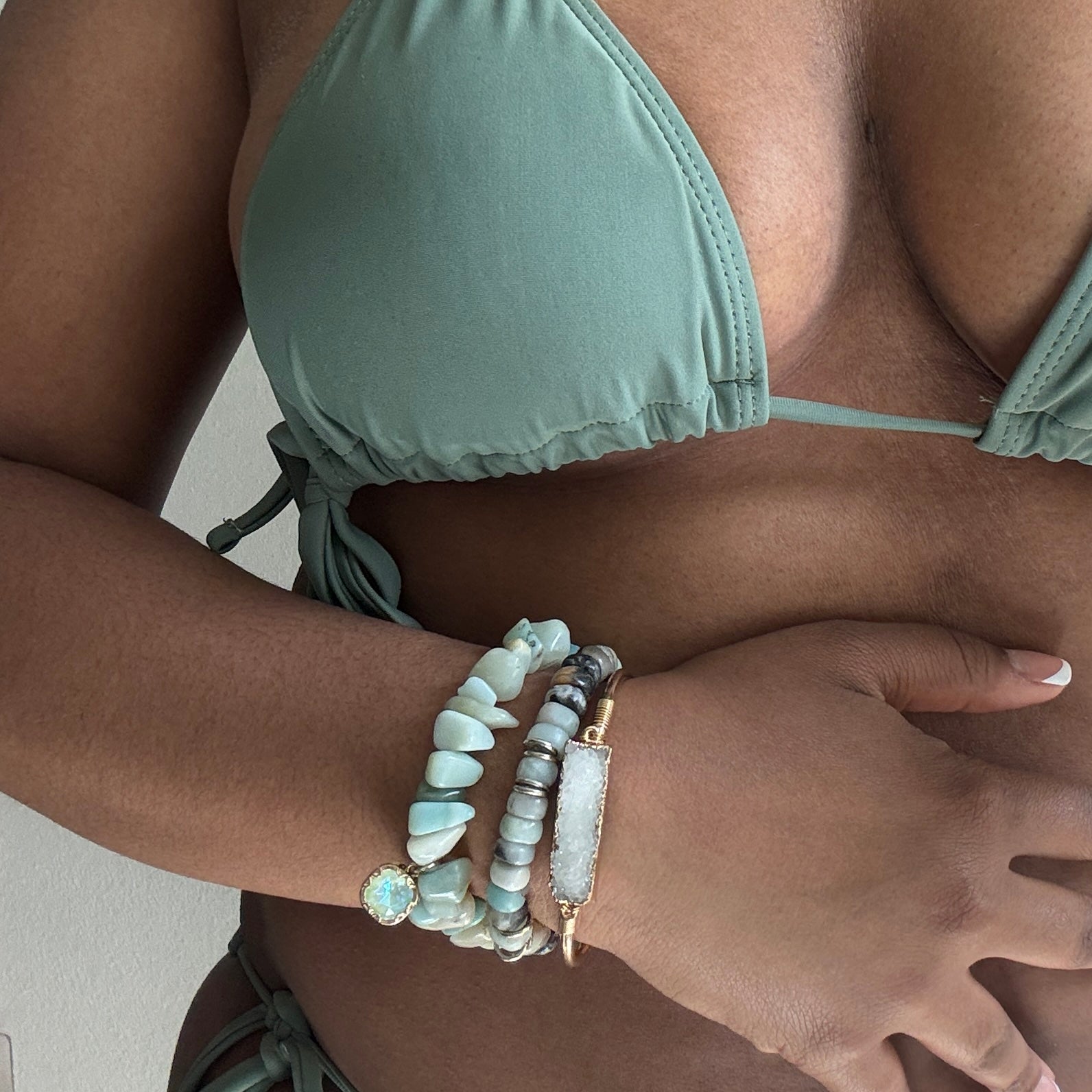 Thunderstone is crafted with grounding Dalmatian Jasper and a powerful raw grey druzy bar, symbolizing the strength found in life’s heaviest storms.