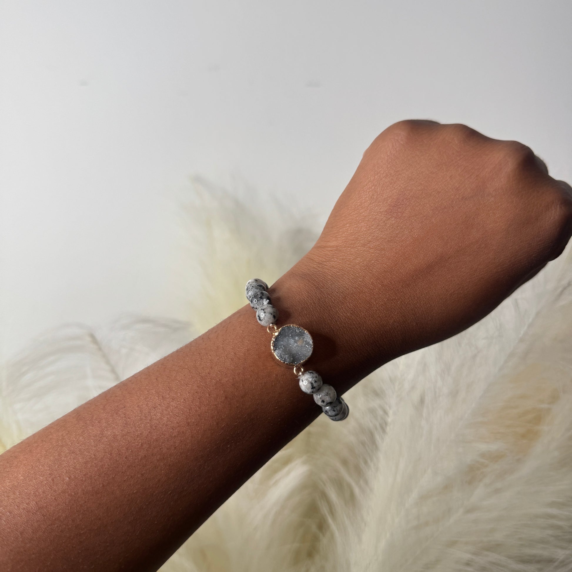 Calm After is the essence of serenity that follows a storm. With stabilizing Dalmatian Jasper and a serene grey druzy charm, this bracelet brings you back to center. It encourages emotional recovery, grounded peace, and softness after intense seasons of growth. A reminder that even the strongest storms eventually pass—and what’s left is a clearer, calmer you.