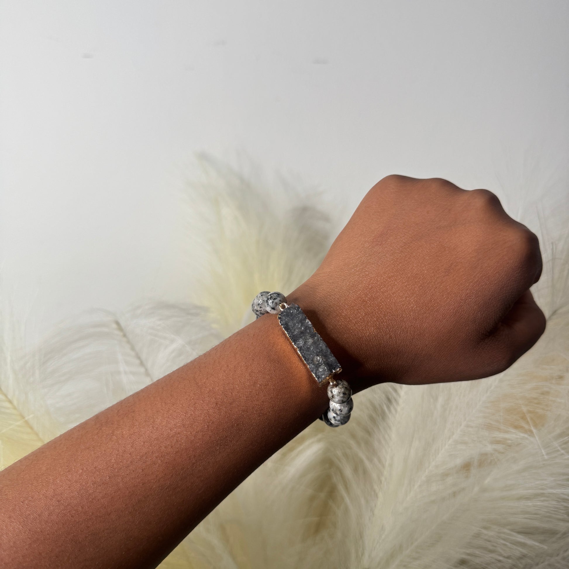 Thunderstone is crafted with grounding Dalmatian Jasper and a powerful raw grey druzy bar, symbolizing the strength found in life’s heaviest storms. This bracelet embodies emotional protection, resilience, and the courage to release old versions of yourself. Like thunder rolling through the sky, it reminds you that transformation often begins with disruption—and that every storm brings you back to your power.