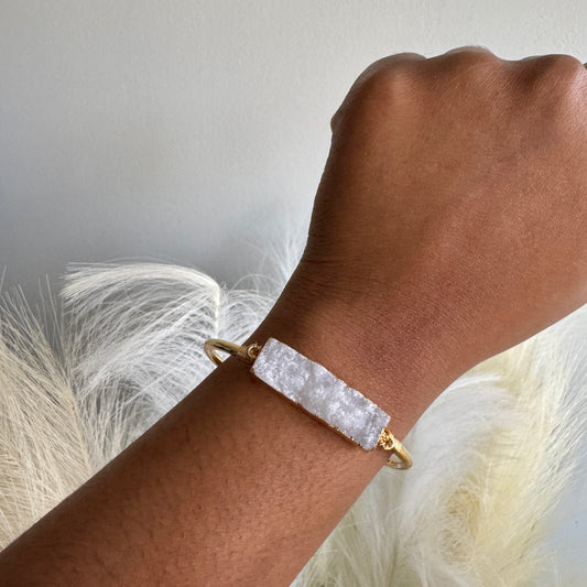 Thunderstone is crafted with grounding Dalmatian Jasper and a powerful raw grey druzy bar, symbolizing the strength found in life’s heaviest storms.